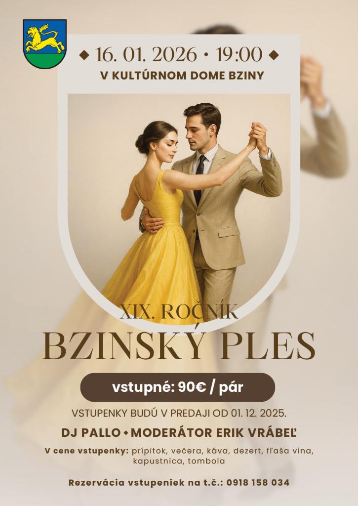 Vážení občania, srdečne Vás pozývame na Bzinský ples, ktorý sa uskutoční 16.01.2026 v KD Bziny.